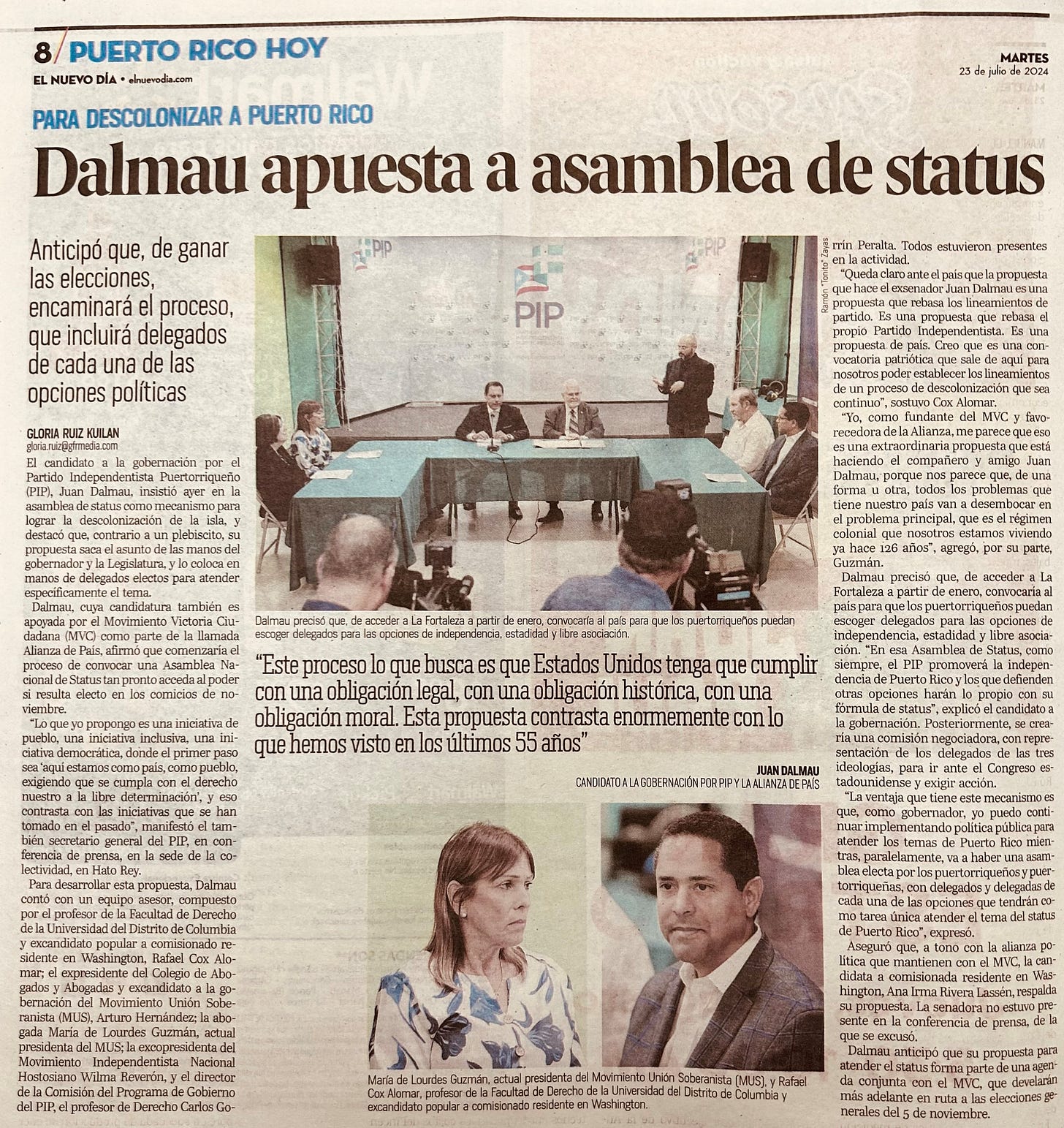 Dicté la conferencia que reproduzco a continuación en el 2013 sobre la propuesta de la asamblea del status para atender el problema político de Puerto Rico. Vista la propuesta de Juan Dalmau del PIP, creo que la conferencia sigue siendo relevante. Por supuesto, el lector debe hacer algunos ajustes para tomar en consideración los desarrollos posteriores en el tema del status, muy en particular el caso Pueblo de Puerto Rico v. Sanchez Valle (2016) en donde el Tribunal Supremo de los Estados Unidos expresamente le negó cualquier soberanía primigenia a Puerto Rico. Publicado en la Revista Jurídica de la Universidad Interamericana de Puerto Rico, Volumen XLVIII: 2:523 (2013).