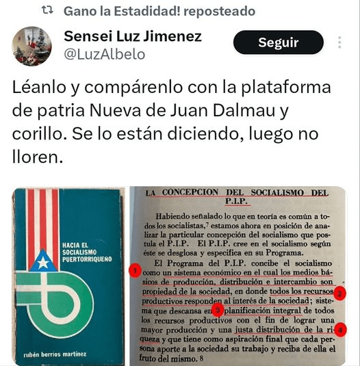 Tenemos que tener mucho cuidado (particularmente los jóvenes) de que por rechazar la corrupción que haya ocurrido en los partidos políticos tradicionales no caigan en la trampa de apoyar a un comunista como Juan Dalmau candidato a gobernador por una mogolla que pretende vendernos mediante palabrería romántica patriótica una independencia socialista comunista que nos lleve al cabo de un corto tiempo a una república al estilo Cuba, Venezuela Y Nicaragua admirados por estos nacionalistas, socialistas.